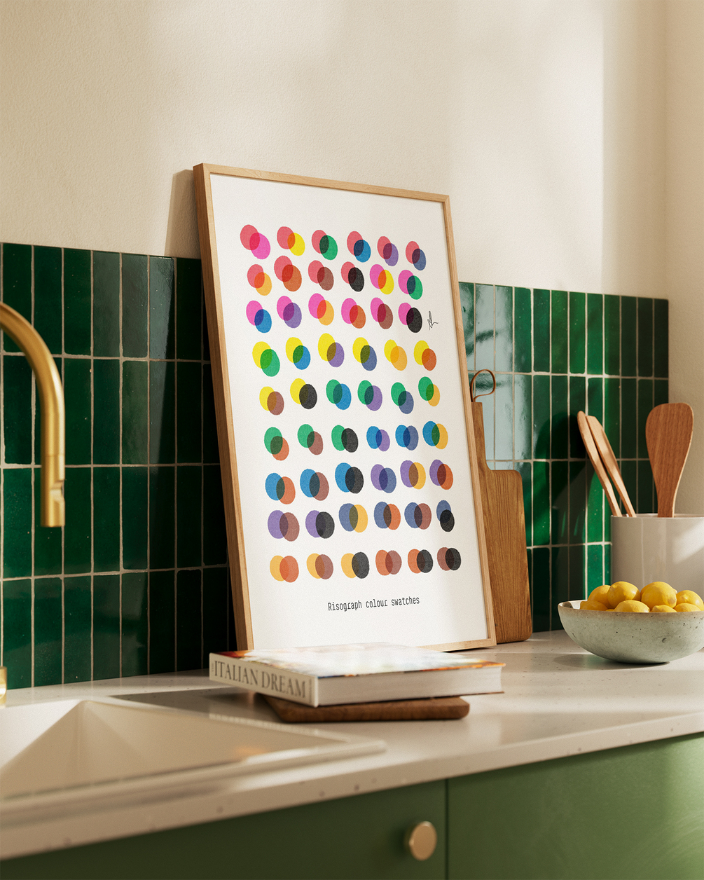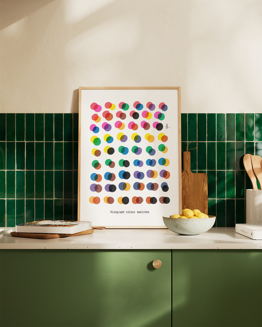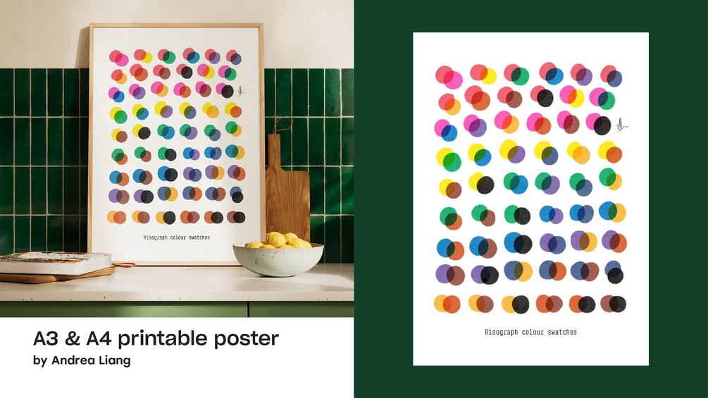 You will receive a set of high resolution (300dpi) A3 (297x420mm) and A4 (210mm x 297mm) printable JPEG and PDF files in CMYK for "Risograph colour swatches". The design is portrait orientation. There is a 20mm white border around the design.